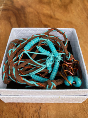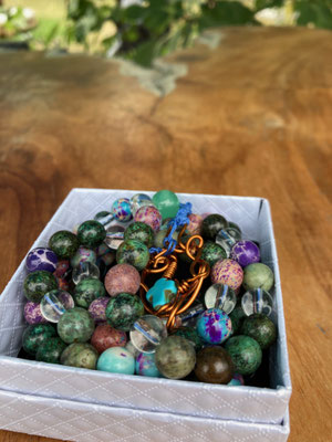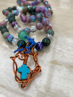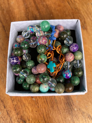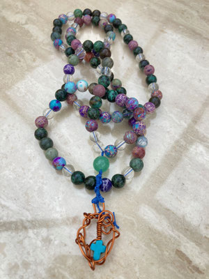 African turquoise and speckled turqoise with clear quarts and Jade mala with Turquoise cross and copper £155
